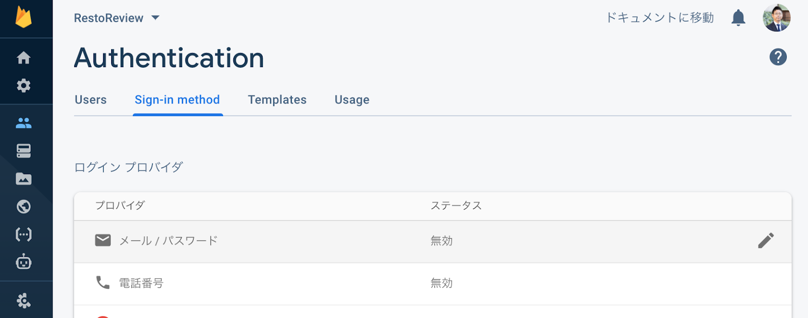 Firebaseには様々な認証をサポートする機能としてFirebase Authenticationがあります。画面左メニューから「Authentication」を選択し、「Sign-in method」タブを選択します。