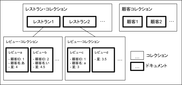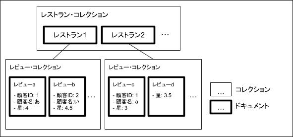 レビュー・ドキュメントの配列であるコレクションをレストラン・ドキュメント配下に追加します。この時、レビュー・ドキュメントには書き込みを行った顧客がわかるように顧客IDと顧客名と顧客写真を追加します。また、レビュー・ドキュメントを参照するだけで書き込みを行ったレビュー対象のレストランがわかるよう、レストランID、レストラン名、レストランロゴといった項目も追加します。以上の作業の必要性については「NoSQLとFirestoreについて」を参照してください。